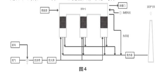 在廢氣處理項目中,3塔RTO一般與風(fēng)機,噴淋塔,阻火器,煙囪等組成一個系統(tǒng)。RTO一般正壓運行,風(fēng)機應(yīng)選擇變頻控制適應(yīng)不同工況。前置噴淋塔可吸收酸、堿性廢氣,減少對RTO爐的腐蝕。后置噴淋塔可進(jìn)一步降低廢氣排放量。有的有熱回收需求,可在末端增設(shè)熱交換器,產(chǎn)生熱水和熱氣回用。煙囪可根據(jù)項目需要設(shè)計,一般至少為15米高,煙囪越高對廢氣擴散有利,成本也越高。系統(tǒng)的組成需要根據(jù)項目來設(shè)定,圖4為某RTO項目工藝流程圖(供參考)。